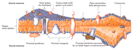 Le membrane e i lipidi polari rappresentano la quasi totalità della massa delle membrane biologiche; la piccola quantità dei carboidrati presenti nelle membrane fanno parte in genere delle glicoproteine o dei glicolipidi. La quantità relative dei lipidi e di proteine variano a seconda del tipo di membrana e riflettono la differenza delle loro funzioni biologiche; i rivestimenti di mielina che servono come isolanti elettrici passivi avvolti intorno a certi neuroni, sono sostituiti principalmente da lipidi, mentre le membrane dei batteri, dei mitocondri e dei cloroplasti, in cui hanno luogo molti processi metabolici catalizzati da enzimi, contengono più proteine che lipidi. Tutte le membrane biologiche presentano alcune proprietà fondamentali: sono impermeabili alla maggior parte dei soluti carichi o polari, ma sono permeabili ai composti non polari; hanno uno spessore che varia da 5 a 8 nm; appaiono composte da tre strati quando sono viste in sezione trasversale al microscopio elettronico. Sulla base delle prove sperimentali, sulla composizione chimica e sugli studi fisici sulla permeabilità e sugli spostamenti delle singole molecole, si prospetta la formulazione del modello a mosaico fluido: vedi figura sotto riportata.