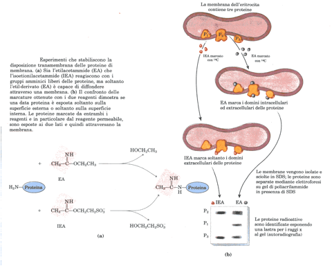 A una temperatura superiore s quella di transizione, il sistema ad anelli rigidi dello sterolo riduce la libertà di movimento delle catene di acido grasso vicine intorno ai legami carbonio-carbonio, e riduce al tempo stesso la fluidità del nucleo interno del doppio strato: gli steroli servono quindi a moderare gli estremi, cioè la solidità e la fluidità assolute delle membrane che li contengono. Mentre i movimenti laterali o le flessioni termiche delle catene acicliche possono avvenire liberamente, un terzo tipo di movimento presenta invece notevoli restrizioni: la diffusione attraverso il doppio strato o flip-flop, il movimento di un lipide da una faccia della membrana all’altra, un processo che determina una grande variazione positiva di energia positiva. Vi sono proteine che facilitano la diffusione a flip-flop, generando una via di trasferimento transmembrana energeticamente più favorevole; sotto questo aspetto l’eritrocita umano è particolarmente conveniente in quanto l’unica membrana presente in queste cellule è quella plasmatica. Esperimenti simili a quelli descritti nella figura sotto riportata hanno dimostrato che la molecola di glicoforina attraversa la membrana dell’eritrocita; il suo dominio amminoterminale (che contiene i carboidrati) è sulla superficie esterna dell’eritrocita, mentre il suo dominio carbossiterminale si estende all’interno della cellula.