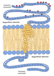 I domini carbossiterminali e amminoterminale contengono molti residui amminoacidici polari o carchi e sono quindi relativamente idrofilici; un lungo segmento al centro della molecola della glicoforina contiene soltanto però residui amminoacidi idrofobici, da queste osservazioni sperimentali è derivata l’organizzazione molecolare della glicoforina (V. figura) – La disposizione della glicoforina nella membrana dell’eritrocita.