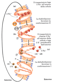 In seguito gli ioni K+ all’esterno si legano ai siti ad alta affinità nella porzione extracellulare della subunità più grande (d); l’enzima viene quindi defosforilato, riducendo la sua affinità per il K+ (e) che viene rilasciato all’interno della cellula (f).