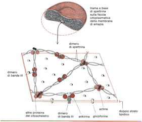 Sul versante citoplasmatico della membrana i dimeri della spettrina si congiungono testa a testa formando tetrameri saldati assieme in un reticolo di brevi segmenti di filamenti actinici e da altre proteine.