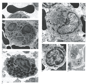 A): eritrocito che mostra il profilo biconcavo e il contenuto omogeneamente denso; B): neutrofilo che mostra il nucleo polilobulato che in sezione appare come profili nucleari separati; C): Eosinofilo, che mostra granulazioni specifiche con inclusioni cristalline; D): monocito che mostra una incisura nucleare, un reticolo endoplasmatico e dei lisosomi; E): piccolo linfocito; F): un gruppo di piastrine.